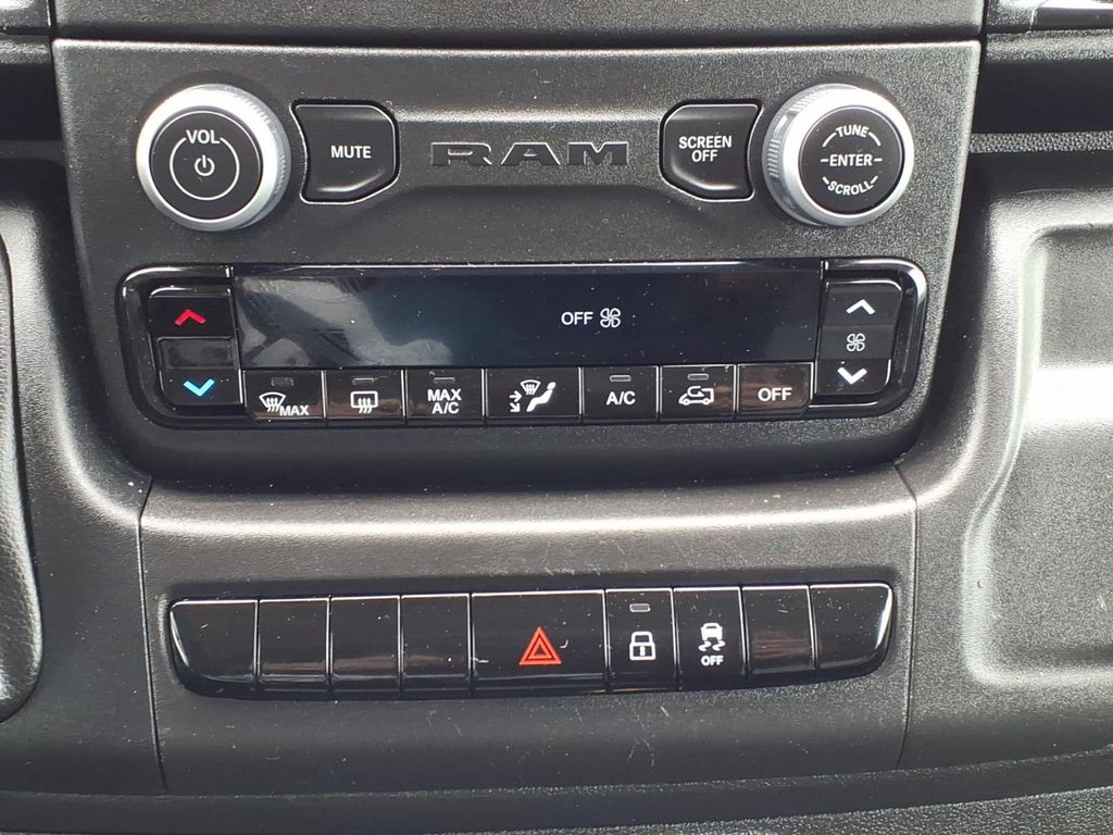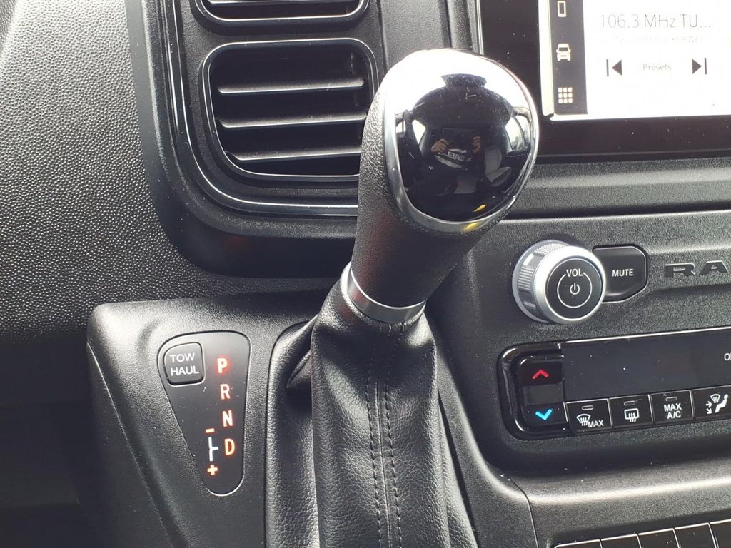 For driver assistance and safety, it includes Full-Speed Forward-Collision Warning Plus, Pedestrian/Cyclist Emergency Braking, Multi-Collision Braking, Drowsy Driver Detection, Traffic Sign Recognition, Electronic Stability Control, Crosswind Assist, Trailer Sway Damping, and a ParkView rear back-up camera. Inside, the sticker lists Uconnect 5 with a 7-inch touchscreen, Apple CarPlay/Android Auto, handsfree phone/audio, a media input hub, upfit interface connector, air conditioning, and power windows.
