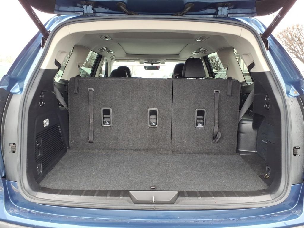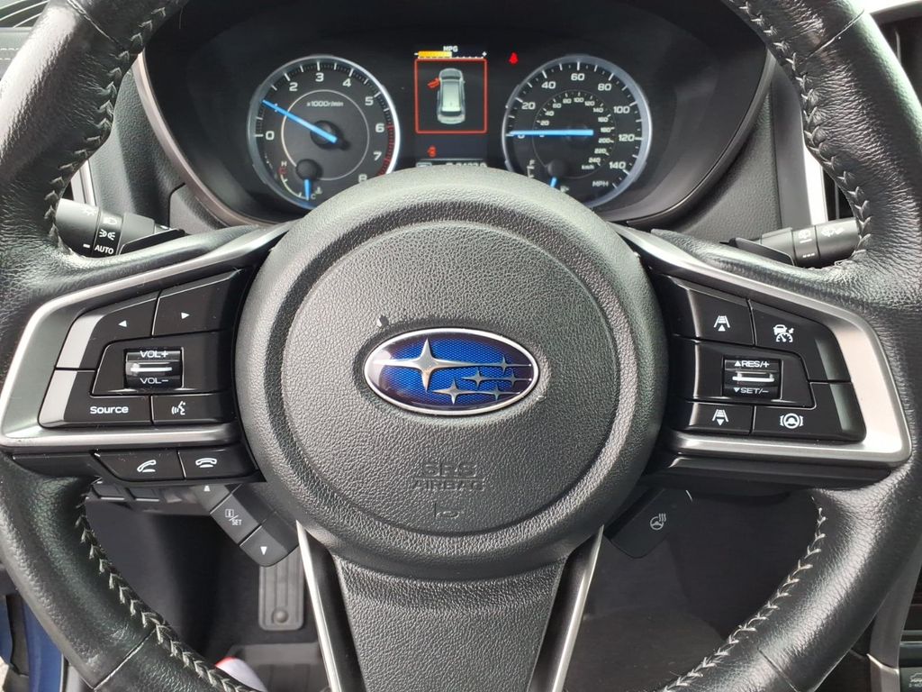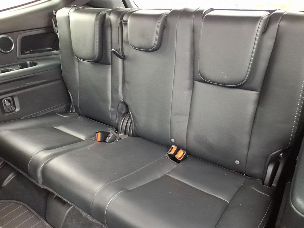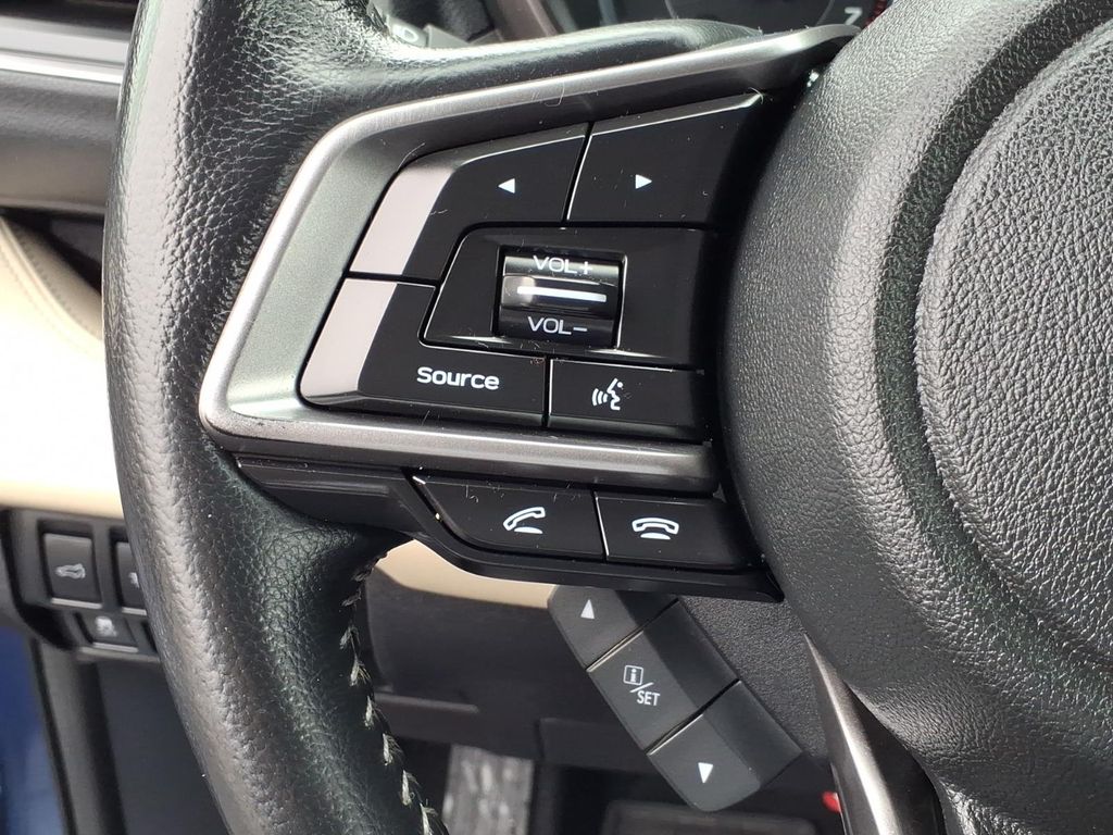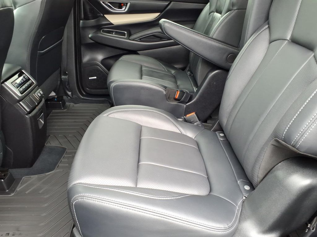 Inside, this used Subaru Ascent Limited offers a comfortable three-row cabin with seating for seven, leatherette dashboard trim, a heated leather-wrapped steering wheel, second-row armrest, folding third-row seat, carpeted floor mats, and useful cargo space features including a cargo area cover and concealed storage. The cabin is designed for family travel and everyday utility while still delivering modern driver-assist and infotainment features.
